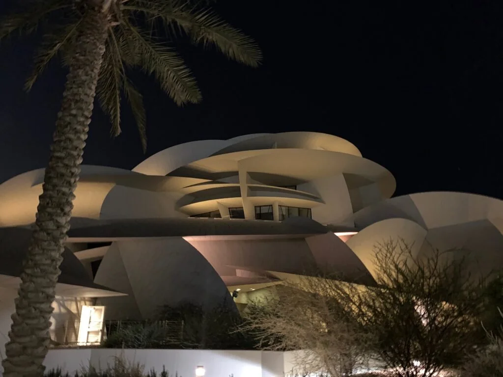 Museet är ritat av den qatariska kungafamiljens favorit; den franska arkitekten Jean Nouvelle och formen är inspirerad av den karaktäristiska öken-salt-rosen som bildas när persiska vikens sälta möter dammet i den Qatariska öknen. I den fantastiska byggnaden huserar en ny basutställning om landets natur och kultur, samt den tillfälliga utställningen The Making of Doha,vilken fokuserar på de senaste decenniernas snabba framväxt av huvudstaden i det lilla ökenlandet med den stora gasexporten. Före oljan, för 50 år sedan, fanns här pärlfiskare och beduiner, nu är Doha en stad av skyskrapor med 2 miljoner invånare, varav 90% är utlänningar. När jag flyttade hit för 13 år sedan var Doha i storlek som Göteborg, nu rymmer staden lika många människor som Stockholm.